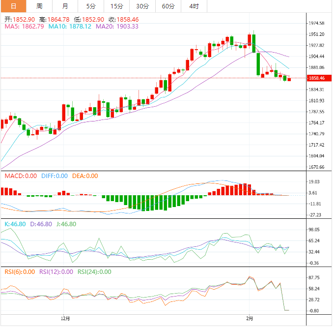 周二盘中,现货黄金震荡微涨,目前交投于1858.96美元/盎司,美元指数和美债收益率延续隔夜跌势,给金价提供支撑,不过,在晚间美国1月份CPI数据公布前,市场整体交投还比较谨慎。