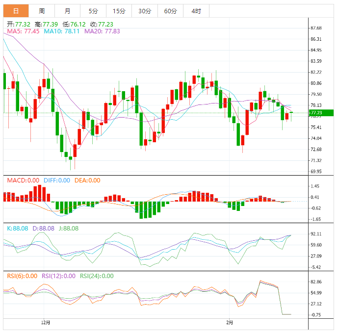 今天的预期交易区间在74.70支撑位和78.00阻力位之间。