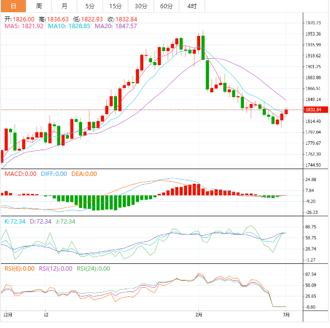 周三盘中,现货黄金震荡上涨,一度创四个交易日新高至1832.57美元/盎司,一方面是隔夜金价探底回升后,更多的逢低买盘涌现、一些空头离场,给金价提供支撑,另一方面则是中国2月PMI数据表现靓丽,打压避险美元,也给金价提供反弹机会。