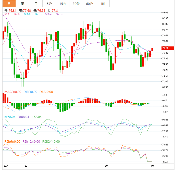 今天的预期交易区间在76.00支撑位和79.00阻力位之间。