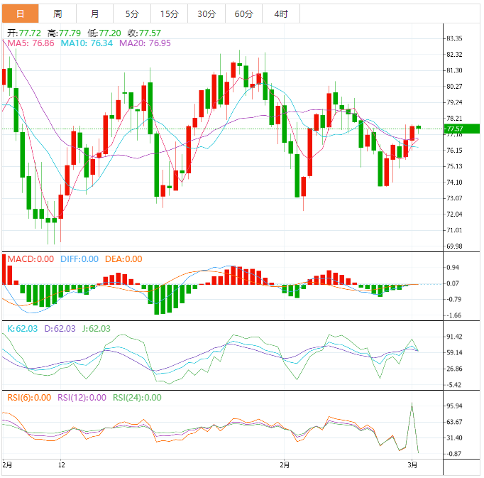 美原油震荡微跌,目前交投于77.50美元/桶附近,美元的反弹令油价涨势放缓。此前美原油连续两个交易日上涨,因为有迹象表明世界第一大石油进口国中国的经济强劲反弹,这抵消了对美国原油库存增加的担忧。此外,印度炼油厂1月原油加工量达到了创纪录的水平。