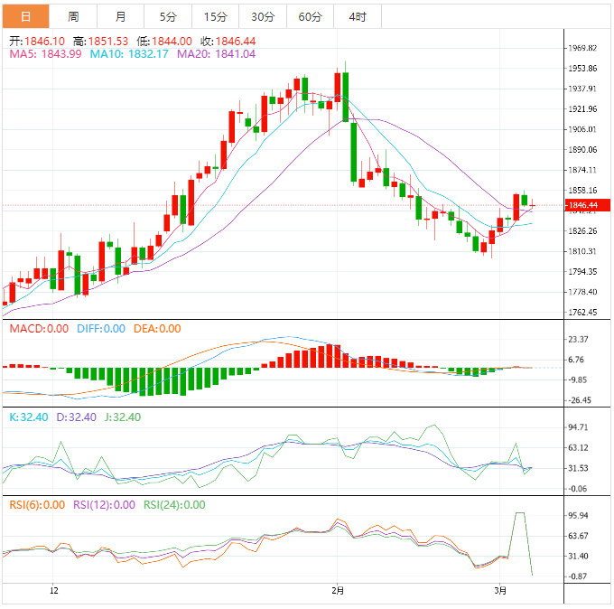 今天的预期交易区间位于1835.00支撑位和1870.00阻力位之间。