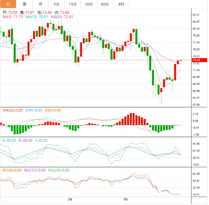 今天的预期交易区间在72.20支撑位和75.50阻力位之间。