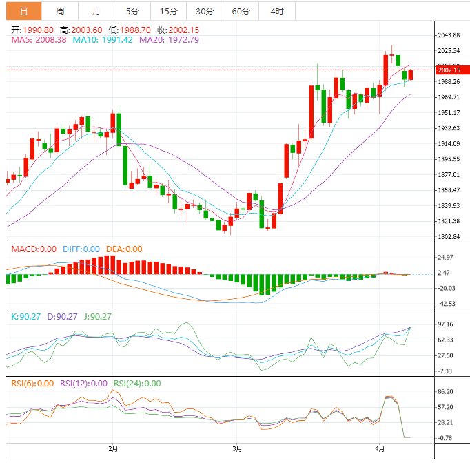 今天的预期交易区间在1980.00支撑位和2010.00阻力位之间。