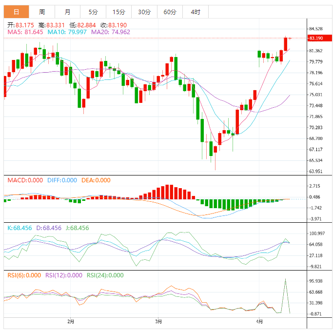 今天的预期交易区间在82.00支撑位和85.00阻力位之间。