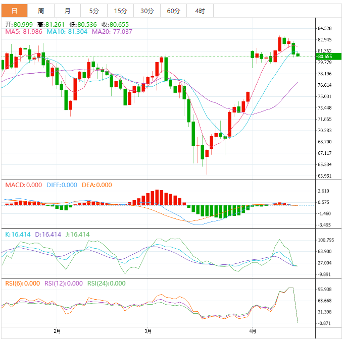 今天的预期交易区间位于79.40支撑位和82.30阻力位之间。