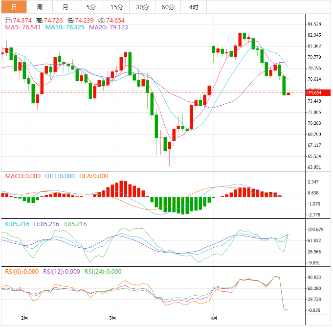 预计今天的交易区间在72.50支撑位和76.00阻力位之间。