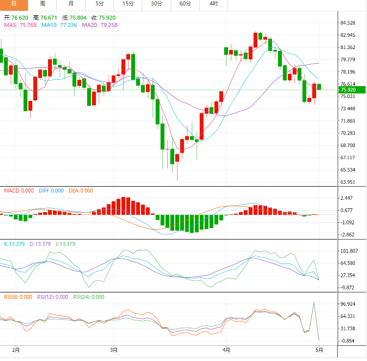 预计今天的交易区间在74.50支撑位和77.70阻力位之间。