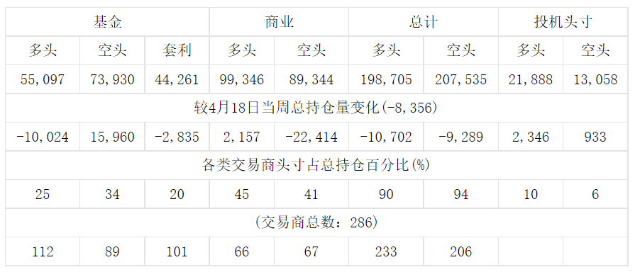 美国商品期货交易委员会(CFTC)最新公布截止4月25日当周COMEX铜期货和期权分类持仓报告: