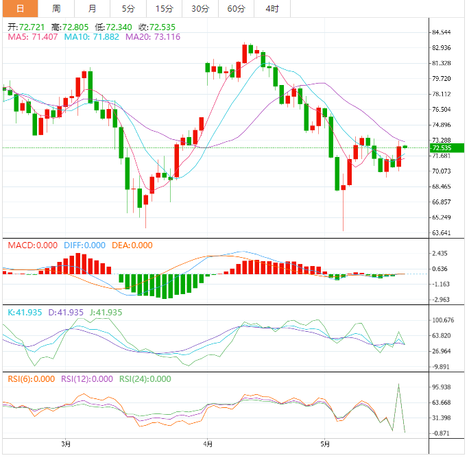 今天的预期交易区间在71.55个支撑位和74.60个阻力位之间。