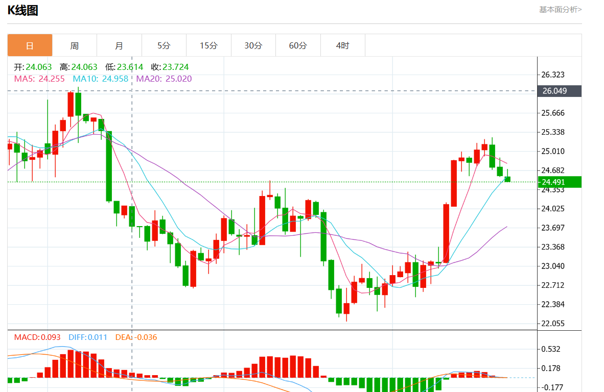 周五欧市盘中,现货白银报24.600,涨跌幅0.8%