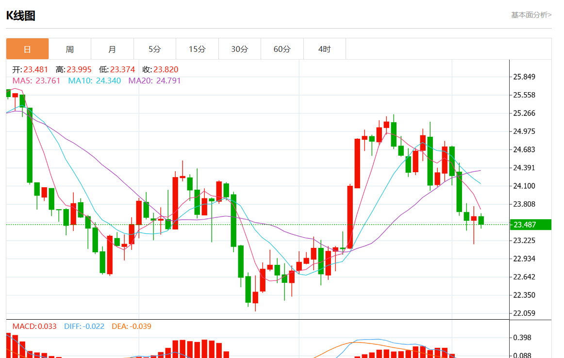 周一欧市盘中,现货白银报23.446,跌幅0.70%。