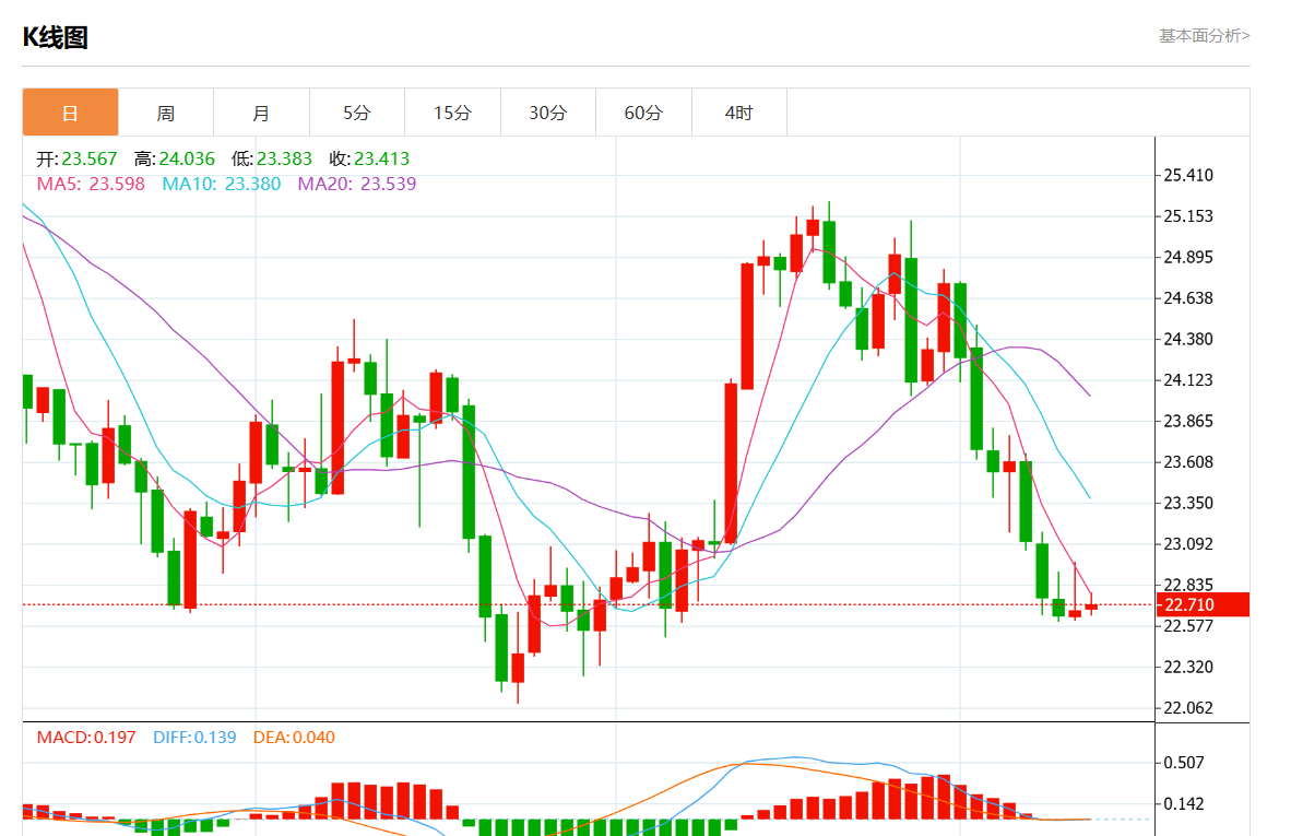 周五欧市盘中,现货白银报22.710,涨幅0.18%。
