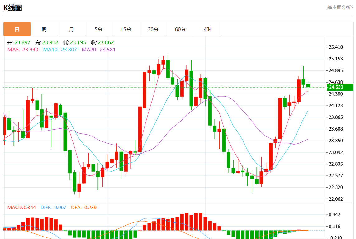 周四欧市盘中,现货白银报24.500,跌幅0.37%。