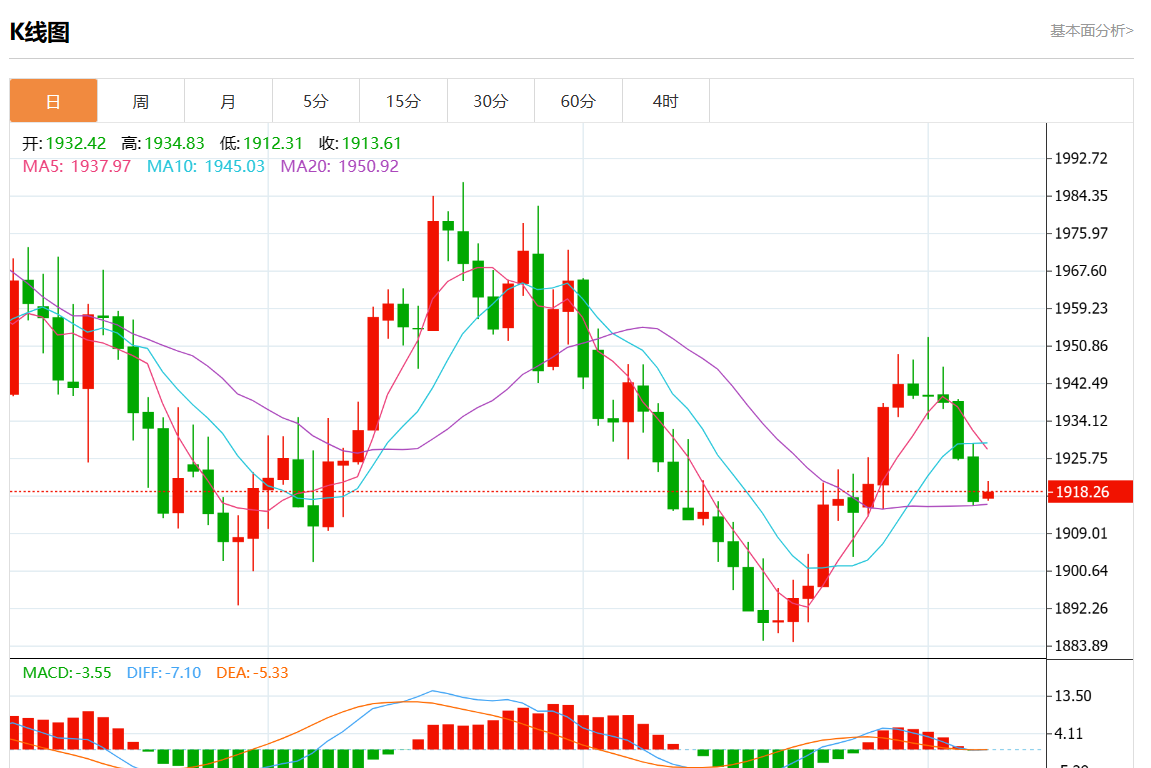 周四欧市盘中,现货黄金报1918.66,涨幅0.13%。