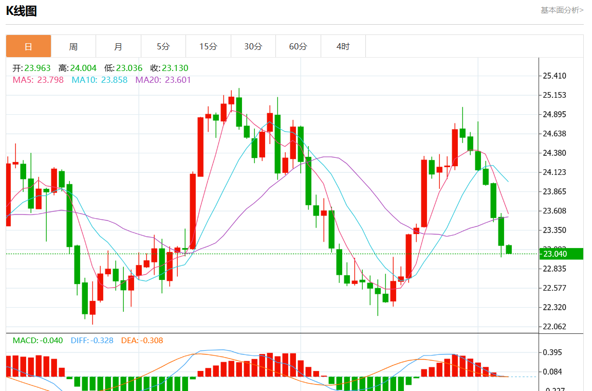 周四欧市盘中,现货白银报23.070,跌幅0.35%。