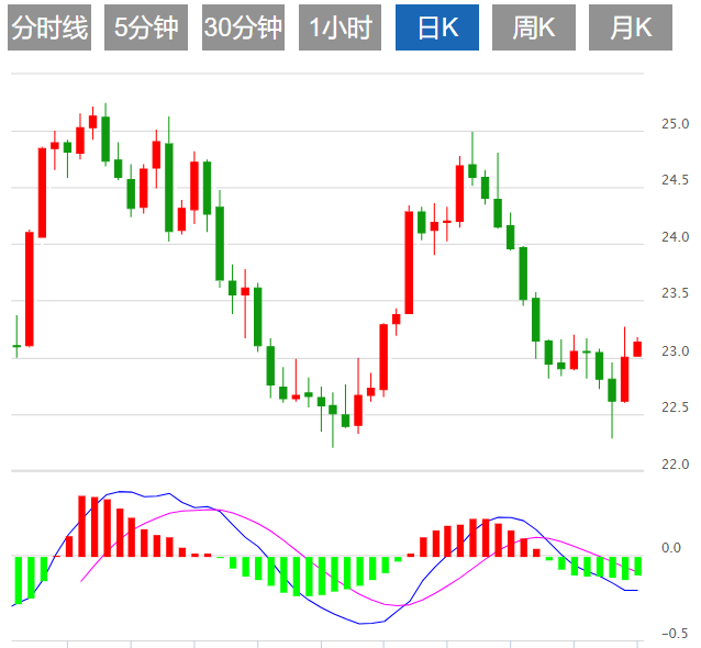 今日预期交易区间在22.90支撑位和23.70阻力位之间。