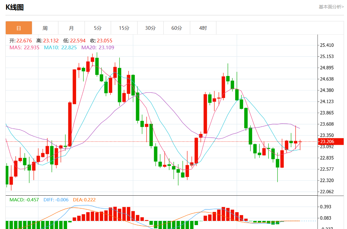 周四欧市盘中,现货白银报23.200,跌幅0.09%。