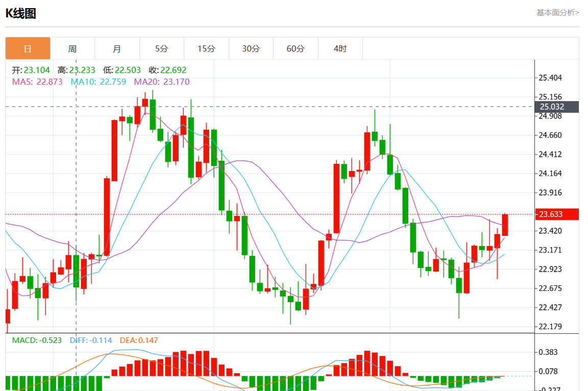 周五欧市盘中,现货白银报23.196,涨幅1.36%。