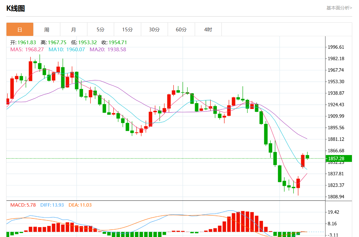 周二欧市盘中,现货黄金报1859.08,跌幅0.12%。