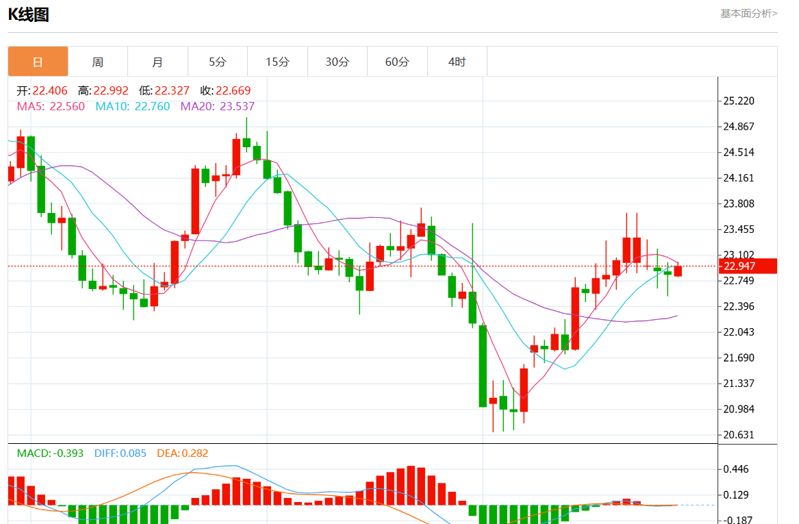周四欧市盘中,现货白银报22.969,涨幅0.57%。