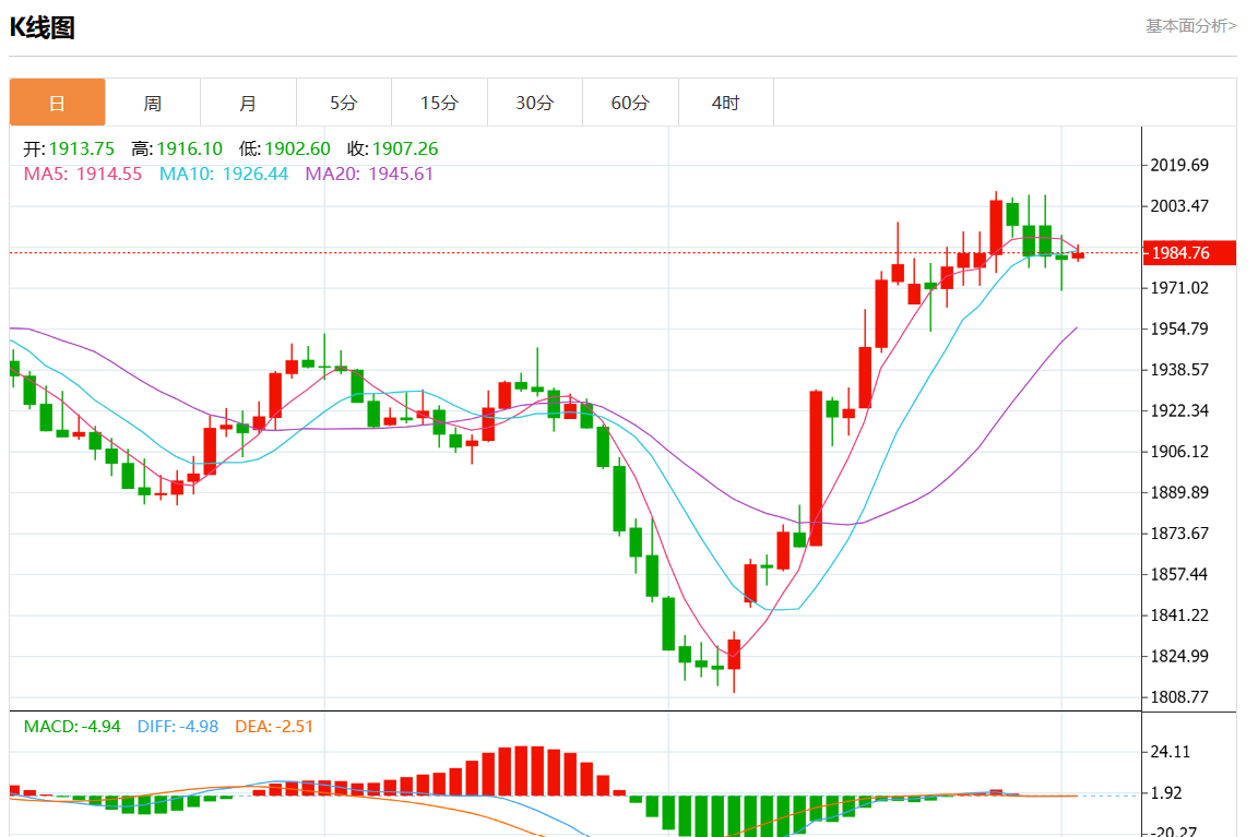 周四欧市盘中,现货黄金报1985.04,涨幅0.13%。