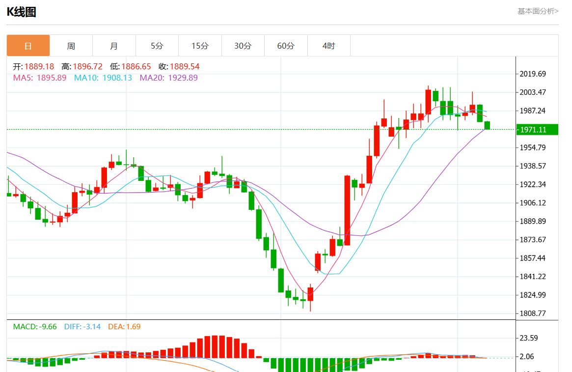 周二欧市盘中,现货黄金报1968.16,跌幅0.48%。