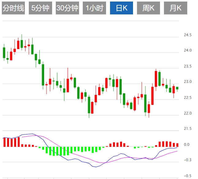 今日预期交易区间在22.30支撑位和23.00阻力位之间。
