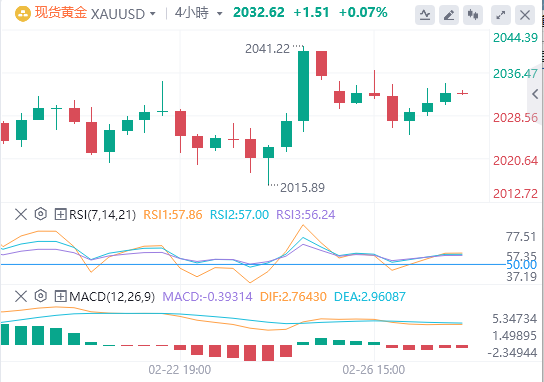 从黄金4小时周期图来看,金价自低点1984.0附近反弹以来,高低点同步上移,形成4H级别上行趋势,短线多头态势显着。并且均线系统MA60和MA20随着价格的上移,也逐步抬高并且拐头向上,对价格具有支撑作用,均线MA20与前低2024.9附近共同对价格形成支撑,下方CCI指标在0轴上方拐头向上显示价格仍然处于强势阶段,并随时可能进一步上行,日内如有回落当以布局多单为主。