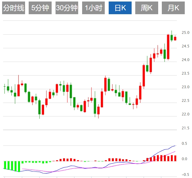 今天的预期交易区间在24.60支撑位和25.30阻力位之间。