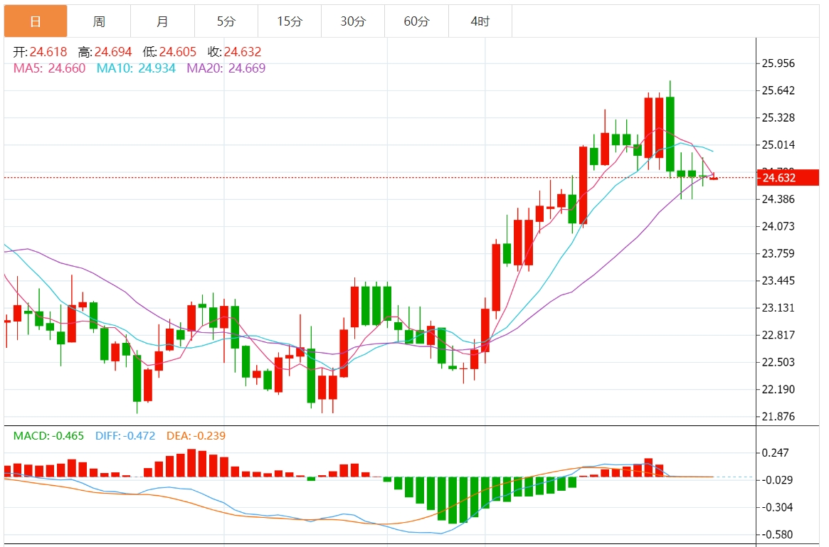 白银价格面临由EMA50形成的24.85美元的坚实盘中阻力。等待积极的势头将价格推高至该障碍上方,直至下一个目标 25.50 美元。