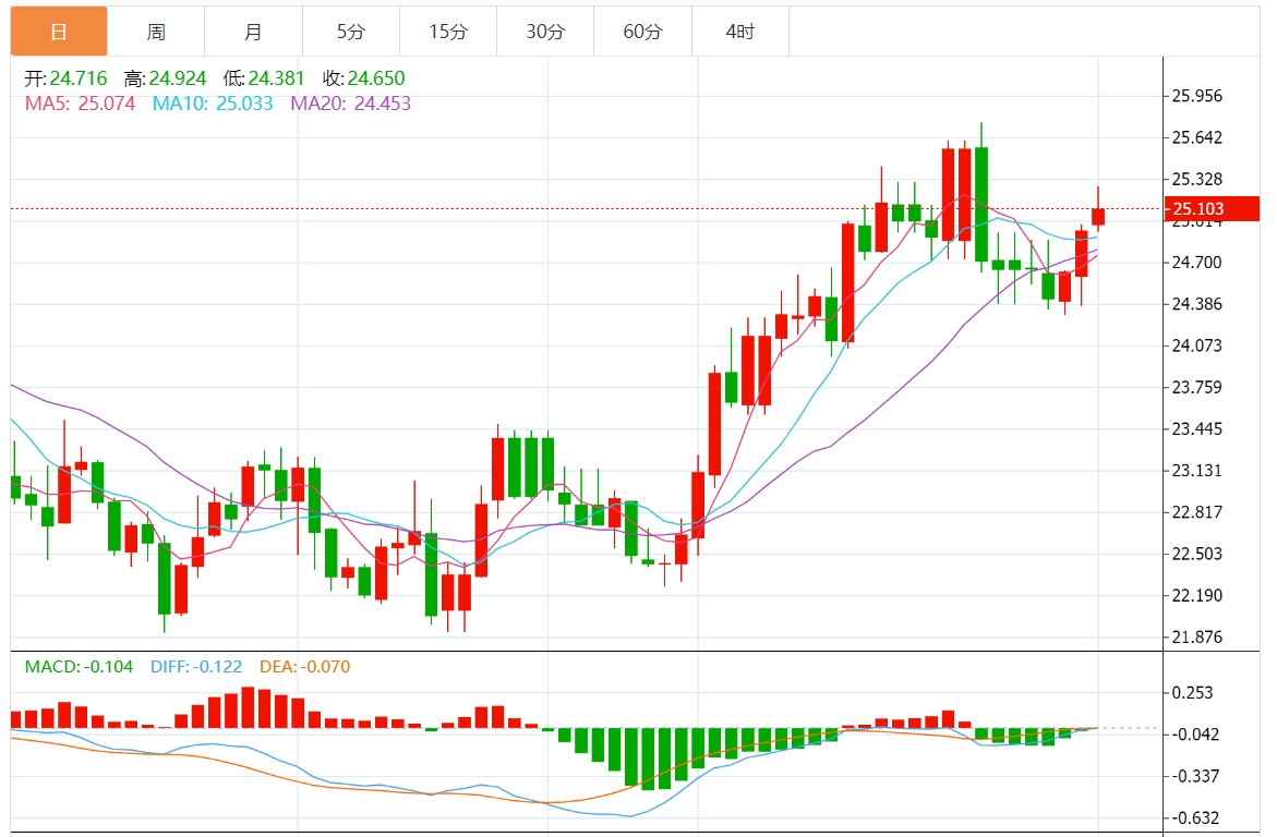 24.73美元的50日均线和上升趋势线表明持续的上升趋势动力。市场情绪在24.97美元上方仍然看涨,跌破可能引发抛售,这与即将发生的经济事件和市场反应相一致。