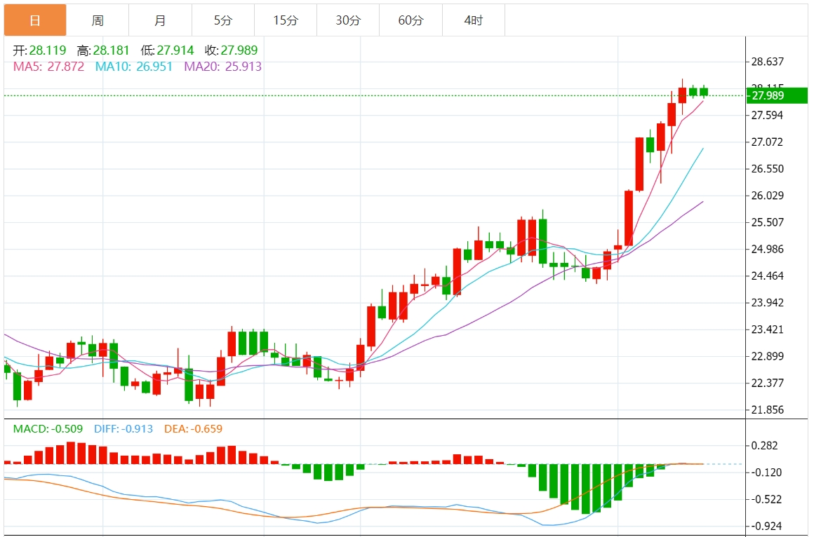 白银价格恢复了牛市涨势,达到了28.75美元的第一个等待目标,显示出进一步上涨,超过了这一水平,并为未来几个交易日的更多预期涨幅开辟了道路。下一个目标是29.40美元。在均线50的支撑下,牛市通道继续组织建议的牛市浪潮。要想继续保持牛市趋势,需要持有28.25美元以上的股票。