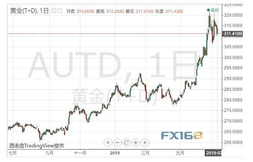 周一(7月8日)黄金T+D下跌1.82元,跌幅0.58%,收314.0元/克,最高触及315.81元/克,最低触及314.00元/克。
