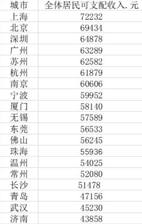 来自华南的两个一线城市深圳、广州与沪京存在一定距离,两市的人均收入分别为64874元和63289元。