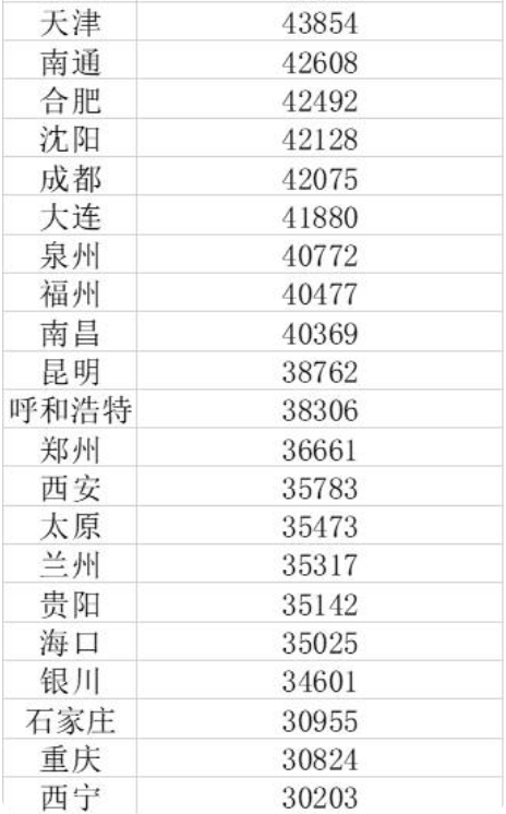 40个城市中,人均收入最低的10个城市均低于3.7万元,除了石家庄和海口外,其余城市均来自中西部地区,尤其是西部地区较为集中,一方面,西部地区大多数城市的高新产业、新兴产业、现代服务业发展要比东部地区滞后不少,整体收入水平较低。