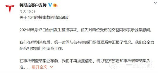 5月18日,特斯拉汽车(北京)有限公司获认证的官方微博发布情况说明称,在得到消息后,第一时间与各有关部门取得联系并汇报了情况,也会全力配合相关部门的调查工作。在事故调查结果公布前,不再披露信息,请以警方鉴定和事故调查结果为准。
