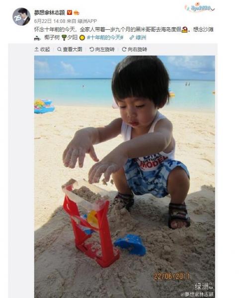 22日,林志颖晒出十年前与kimi在海岛度假的旧照,当时的kimi还只有一岁九个月,林志颖还调侃儿子叫“黑米哥哥”。
