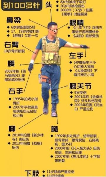 近日,有网友曝出吴京粉丝做的一张关于吴京全身受伤汇总图,从图上来看,他全身缝针高达100多针,涵盖了头部、脸部、手部、脚部等等多处,网友们不禁感叹:“果然没有人能随随便便成功的!”“吴京铁人认证!”