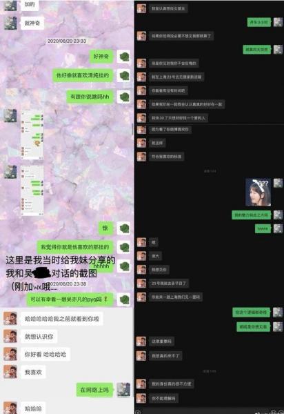 公开与吴亦凡的聊天对话,称大概在2020年8月跟男方加上好友,两人经过一段时间交谈后,男方频繁提出见面,并回答自己有时间谈恋爱,想认真地好好谈恋爱,同时追问女方是不是母胎单身、有没有发生过关系,坦言担心女方被骗。