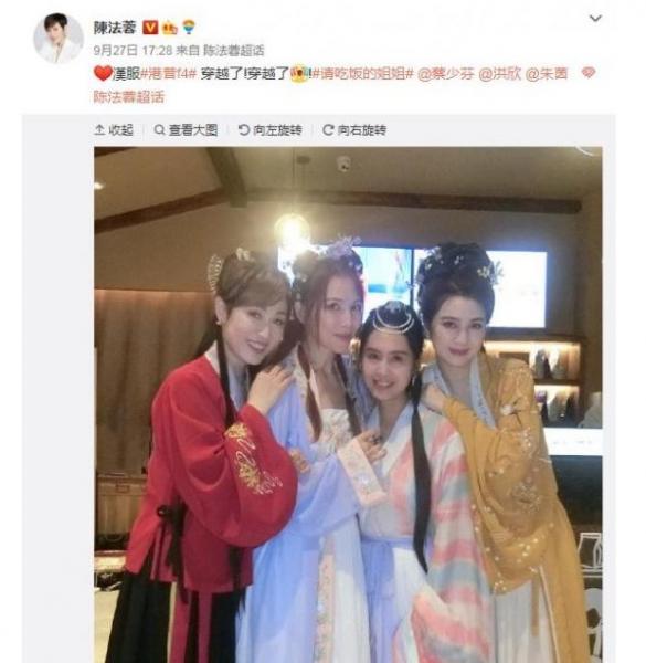9月27日,陈法蓉在微博晒出“港普F4”穿汉服的照片。她还与朱茵蔡少芬洪欣贴脸嘟嘴比心,姐妹情深。