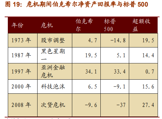 上世纪 70 年代末期以来,美国证券市场一共发生过四次较大规模的股市危机,分别是1973 年股市大调整、1987 年黑色星期一股灾、2000 年科技泡沫破灭、2008 年次贷危机。在历次危机中美国甚至全球股指出现大幅下跌,伯克希尔·哈撒韦公司尽管相比自身其他年份业绩也受到影响,但仍然大幅跑赢大盘。