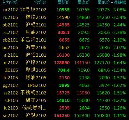 12月22日讯 国内期货市场开盘,商品期货多数下跌,黑色系延续昨日涨势,热卷、螺纹钢涨超4%,铁矿石涨超1%。焦炭、菜粕、豆粕涨超2%,焦煤、豆一、豆二涨超1%。20号胶跌超3%,橡胶、原油、沥青、沪铅、LPG跌超2%。