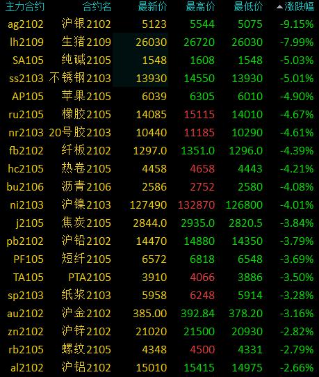 国内商品期货收盘:多数收跌,沪银跌超9%、生猪纯碱不锈钢跌停