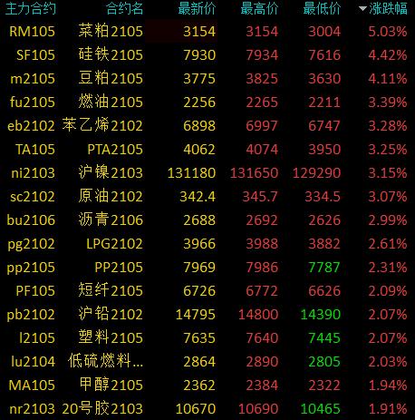1月13日消息 国内期货市场收盘,商品期货多数收涨,农产品(6.19 -4.03%,诊股)涨幅居前,菜粕涨停创新高,涨幅5.03%,豆粕涨超4%,硅铁、燃油、苯乙烯、沪镍涨超3%,沥青、LPG、PP涨超2%,沪银、橡胶、塑料、棉纱、PVC涨超2%。能源板块大跌,焦煤跌超5%,焦炭跌超2%。