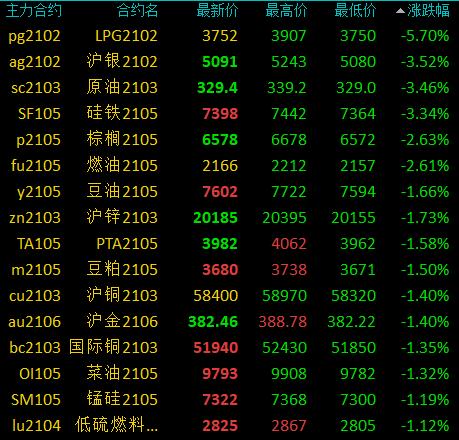 国内商品期货开盘:多数下跌,能源化工领跌、LPG跌超5%