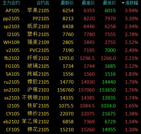 1月18日消息 国内期货市场收盘,商品期货涨跌参半。苹果、PP涨逾3%,塑料、PVC等等涨逾2%,纯碱、NR等涨超1%,沪镍、螺纹等小幅上涨;LPG跌超5%,尿素跌超3%,原油跌逾2%,PTA、焦炭等跌超1%,焦煤、硅铁等小幅下跌。