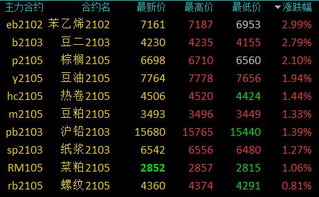 1月26日消息 国内期货市场开盘,商品期货涨多跌少,苯乙烯涨超3%,豆二、棕榈涨超2%,豆油、热卷、纸浆涨超1%;焦炭、焦煤、沪镍、沪锌跌超1%。