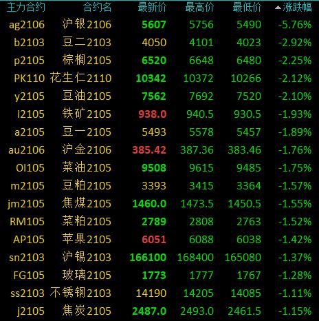 国内商品期货开盘:多数下跌,沪银跌超5%、豆二跌超3%