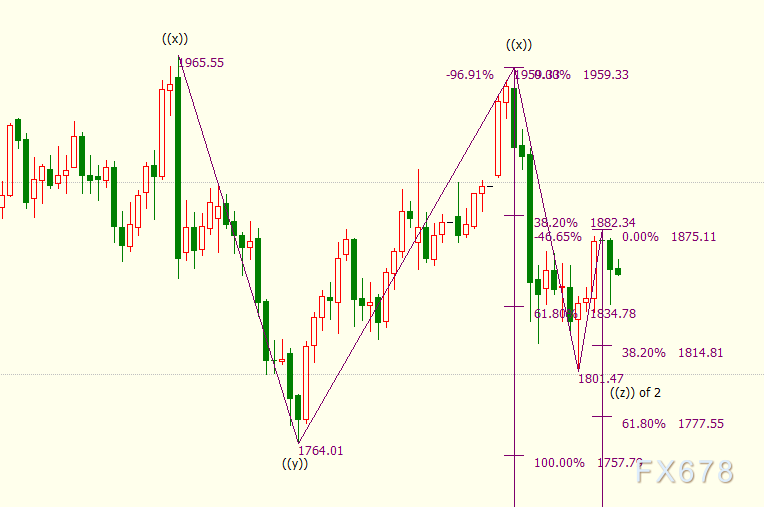 小时图上看,金价在1875美元开启下行(c)浪走势,下方支撑看向38.2%目标位1815美元。(c)浪是自1959美元开启的下行((z))浪的子浪,((z))浪的61.8%目标位在1778美元。
